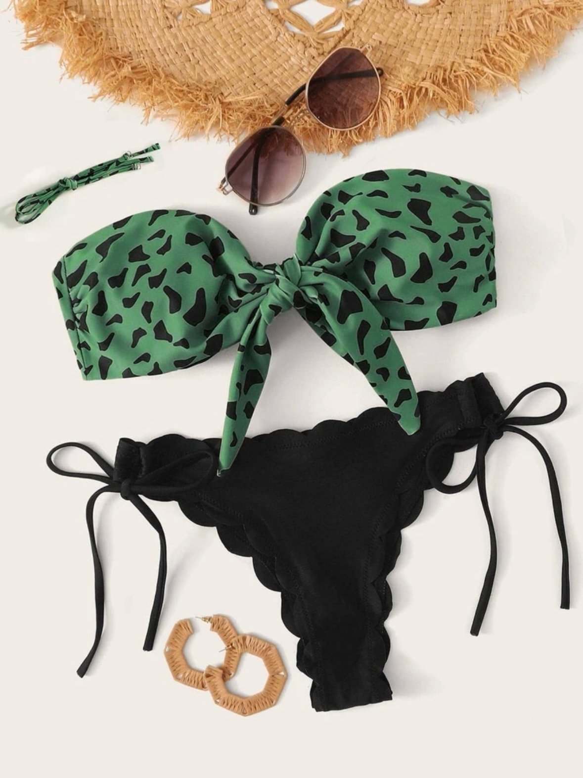 Strapless Scalloped Graphic Print Women’s Bikini Set Knot Front