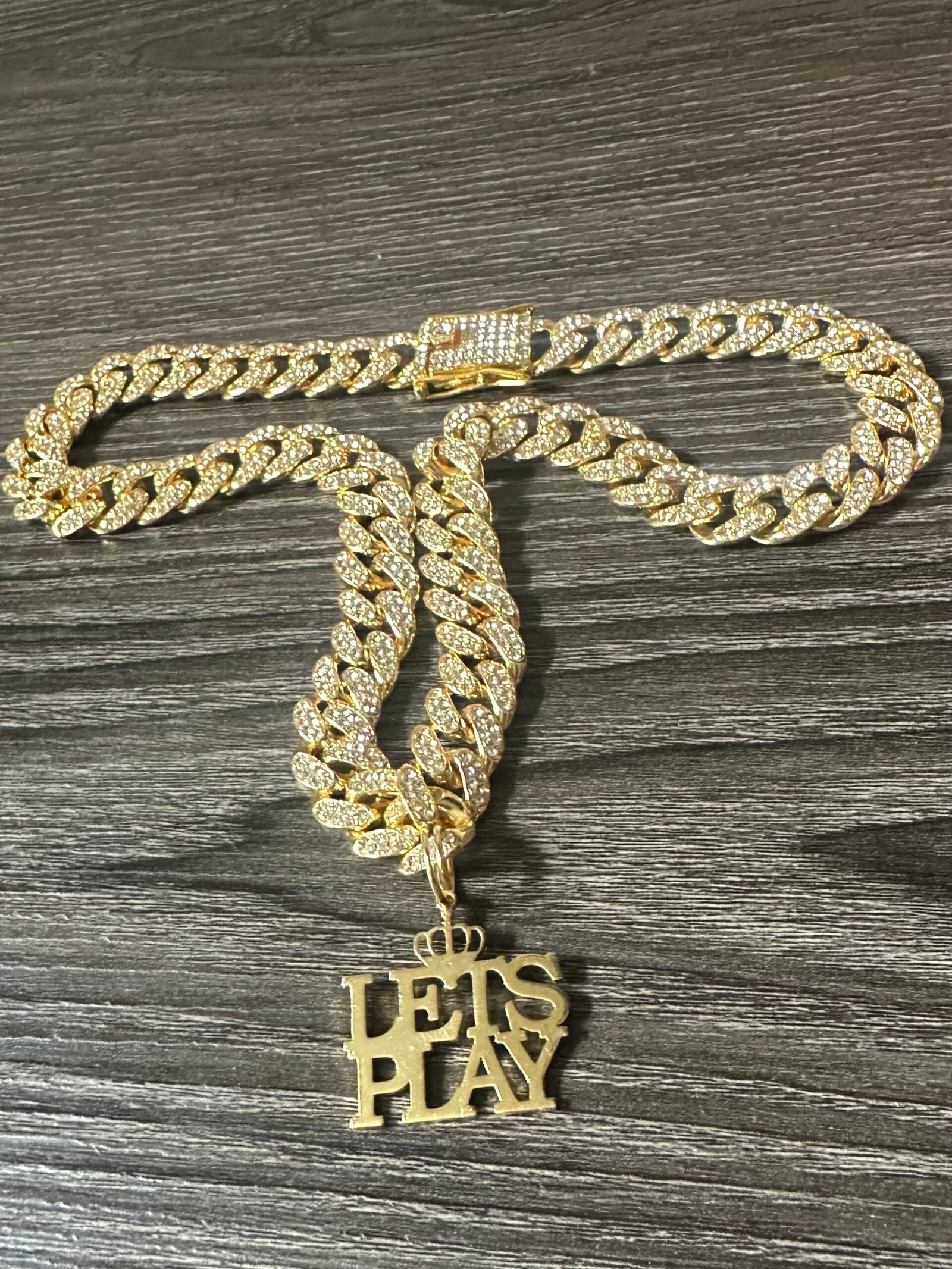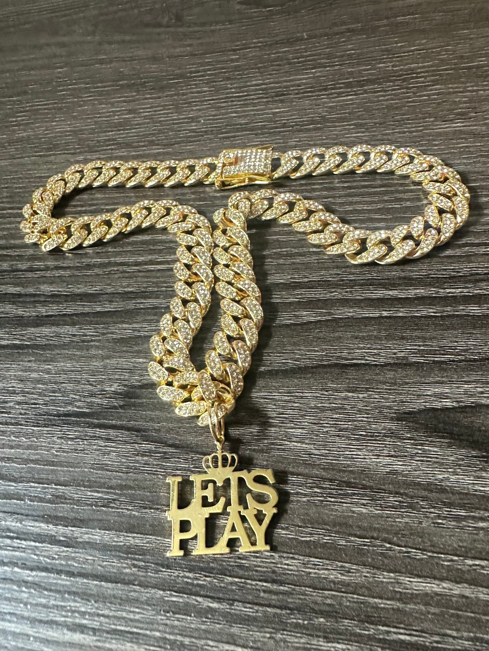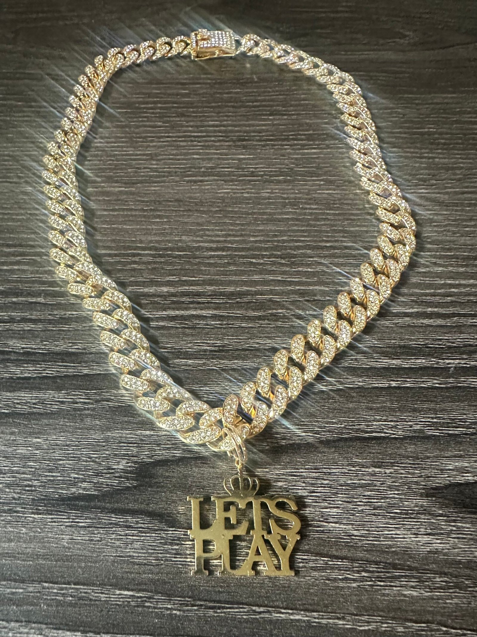 Gold colored rhinestone 20 inch chain with Let’s Play and crown